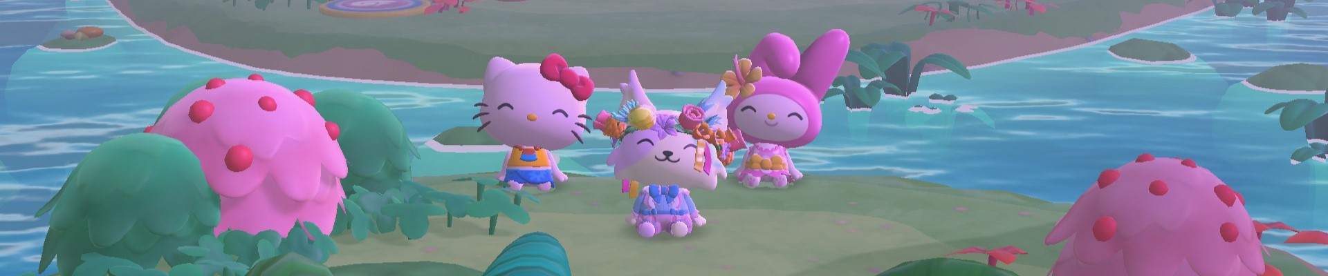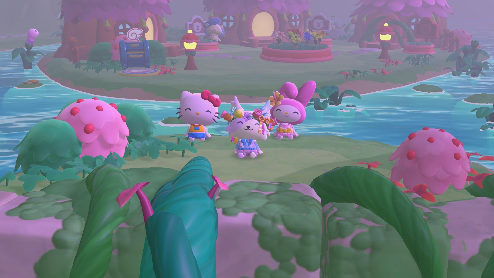 the above image is of 'hello kitty island adventure' and depicts my character sitting in a meadow alongside hello kitty and my melody. i find it to be incredibly cute, wouldn't you agree?
